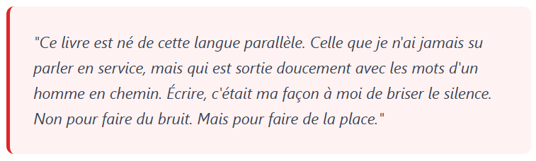 Son écriture, à la fois sobre et poétique, révèle ce que la vie en uniforme laisse rarement paraître : la fragilité derrière la force, la lumière derrière les flammes.